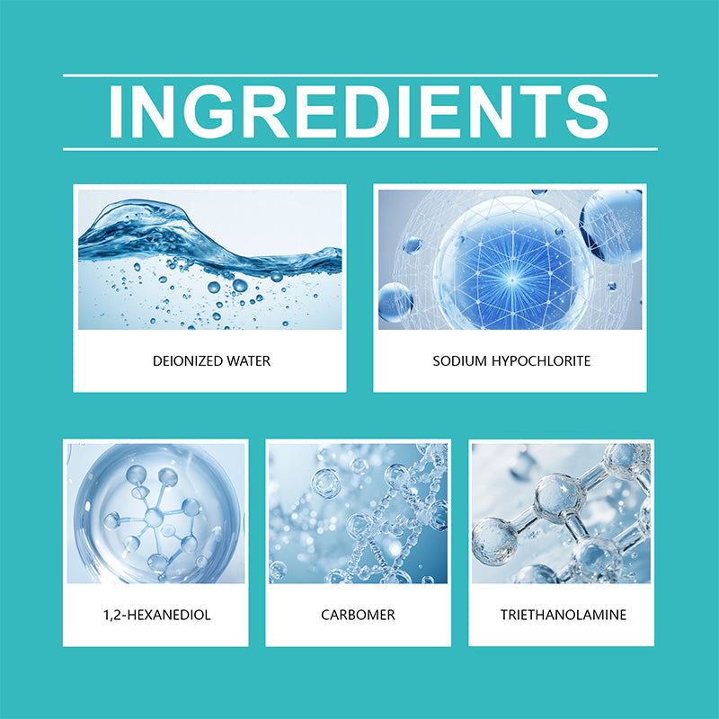 Ingredient: Deionized Water, Sodium Hypochlorite, 1,2-Hexanediol, Carbomer, Triethanolamine